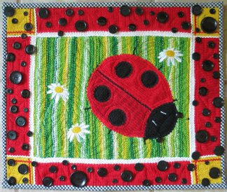 The black buttons on the ladybug wall hanging were meant to echo the spots on a ladybug’s carapace. I think there are nearly 90 buttons on this wall hanging, and I was very disappointed at the time that the level of buttons in our button jar didn’t seem to be affected by the loss.